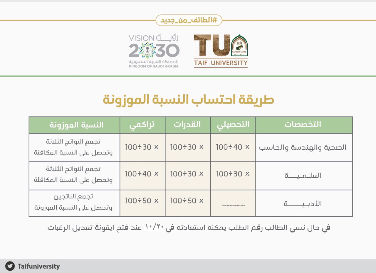 تبلغ نسبة القبول في جامعة الطائف 1،443 شخصًا يرغبون في الالتحاق بالجامعة بعد التخرج من الثانوية العامة ، حيث يوجد في الجامعة العديد من التخصصات. نسب القبول في جامعة الطائف 1442. نسب القبول للعام ١٤٤٢/١٤٤١ هـ. نشرت جامعة الطائف في المملكة العربية السعودية نسب القبول في الجامعة للعام 1443 للطلاب والطالبات وأسماء المقبولين للعام الدراسي الجديد. وتتباين كل كلية في الجامعة عن غيرها من الكليات في نسب قبول جامعة الطائف 1443 ما يدفع الكثير من الطلاب والطالبات للبحث عن طريقة حساب نسب القبول في جامعة الطائف 1443، ما جعلنا نرصدها عبر السطور. توفر الجامعة مجموعة من التخصصات للطالبات بنسب قبول محددة وتختلف عن نسب قبول الطلاب، حيث أن هذه الجامعة تعتبر من الجامعات السعودية العريقة، والتي تضم عدد كبير من الطالبات والطلاب. نسب القبول في جامعة الطائف 1443 للبنات. كم هي نسب القبول في جامعة الطائف 1443. نسب القبول المعتمدة في جميع التخصصات. 29 مارس 2021 , 11:03. تم الإعلان حول نسب القبول في جامعة الطائف في تخصصات مرحلة البكالوريوس للعام الدراسي 1442/1443، وتلك النسب أتت وفق مستوى الثانوية العامة لذلك العام الدراسي، إذ يوجد بعض من الاختلافات بنسب القبول التي يحصل عليها الطلبة والطالبات، وسنوضح لكم أدنى حد من نسب القبول في الجامعة. قامت جامعة الطائف بتحديد نسب القبول داخل جامعتها من خلال تخصصات البكالوريوس، حيث تعتمد على مستوى الدارس خلال الثانوية العامة كما تشمل نسب القبول على: والموافق الأول من شهر أغسطس لعام 2021 ميلاديًا وبالتحديد في الساعة 12 ظهرًا.